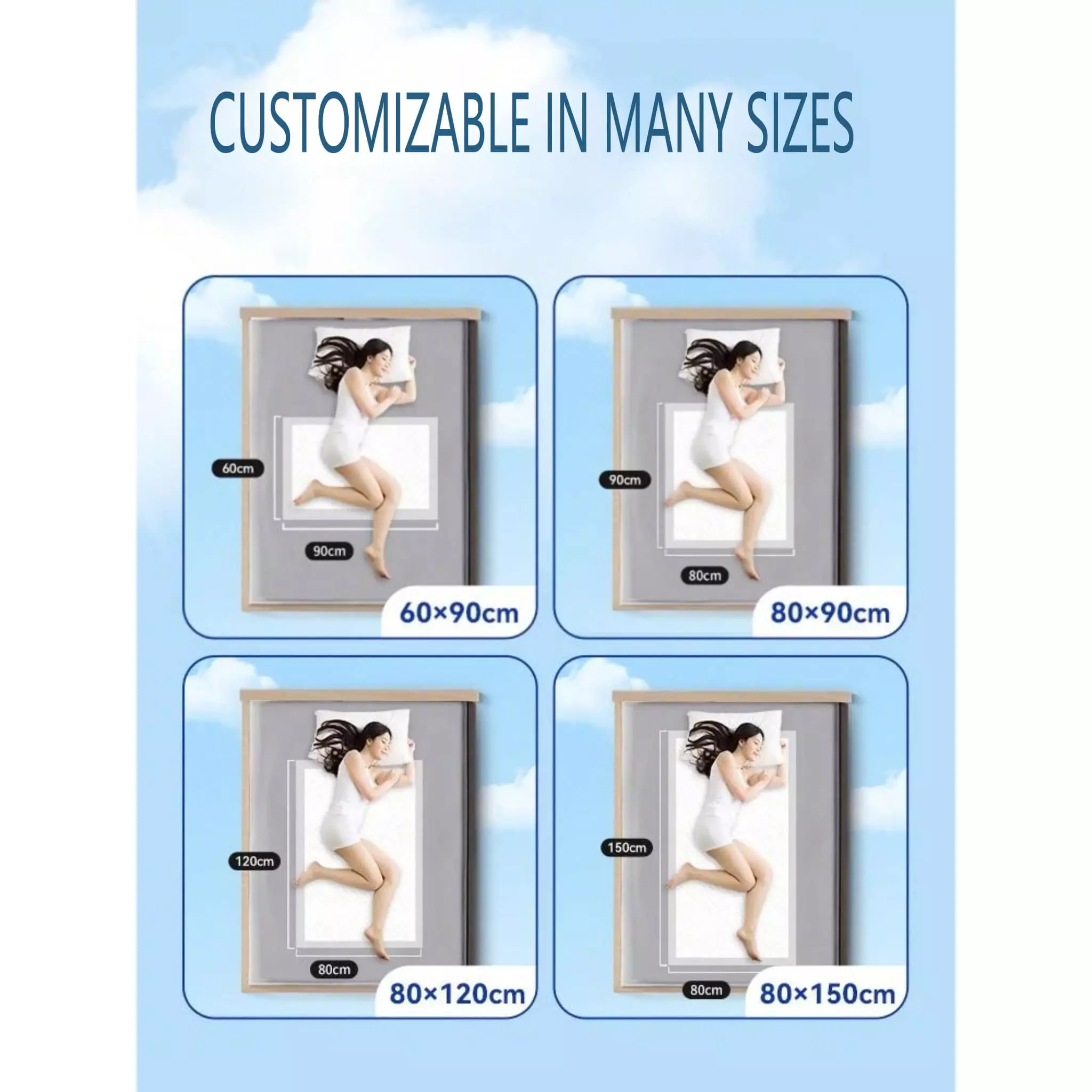Тимус инконтинентни јастучићи Инновативно усваја природна лепршаве пулп и композитну језгру да би се створила 80 * 150цм раствора велике величине велике величине. Процес слагања 6 слојева, реализовање "Инстант усисавање + закључавање воде + цурење + прозрачивање" Заштита четвороструке.